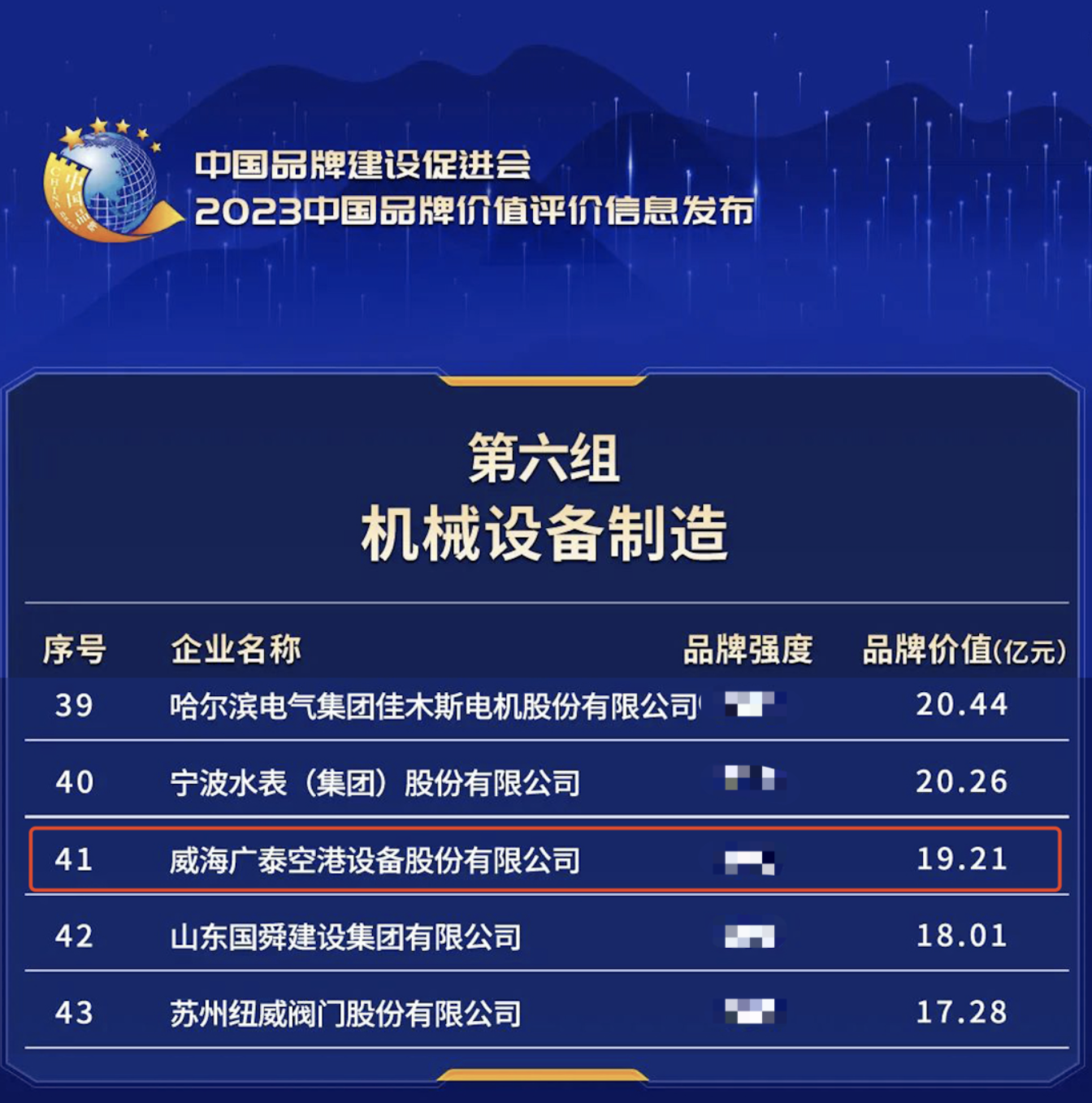 2023年5月11日,新華社、浙江省人民政府、中國(guó)品牌建設(shè)促進(jìn)會(huì)、中國(guó)資產(chǎn)評(píng)估協(xié)會(huì)等單位在浙江德清聯(lián)合發(fā)布“2023中國(guó)品牌價(jià)值評(píng)價(jià)信息”。威海廣泰空港設(shè)備股份有限公司(簡(jiǎn)稱(chēng)“威海廣泰”)在此次發(fā)布評(píng)價(jià)機(jī)械設(shè)備制造組中,品牌價(jià)值獲評(píng)為19.21億元。“中國(guó)品牌價(jià)值評(píng)價(jià)信息發(fā)布”…